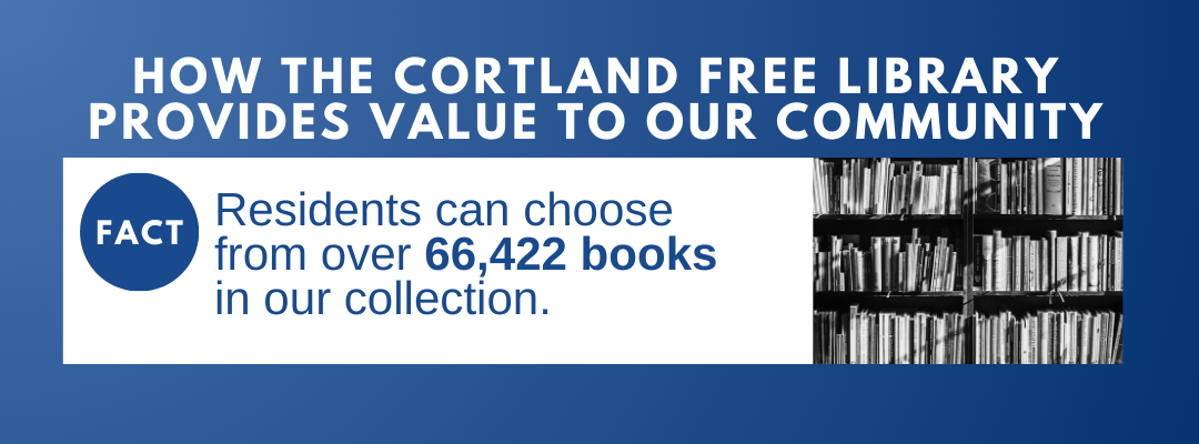 The library is funded through an annual library tax, an endowment, grants, charitable contributions, and support from the Friends of the Cortland Free Library.